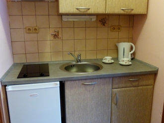 Součástí je vybavená kuchyňka s varnou deskou, lednicí a rychlovarnou konvicí. Najdete zde i základní nádobí pro vaření. Apartmán má vlastní koupelnou se sprchovým koutem, WC, umyvadlem a zrcadlem.